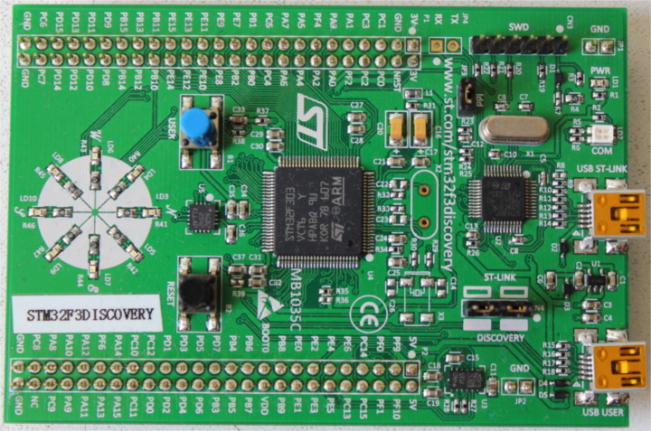 A word of caution: be careful if you want to apply external signals to the board. The microcontroller STM32F303VCT6 pins take a nominal voltage of 3.3 volts. For further information consult the 6.2 Absolute maximum ratings section in the manual